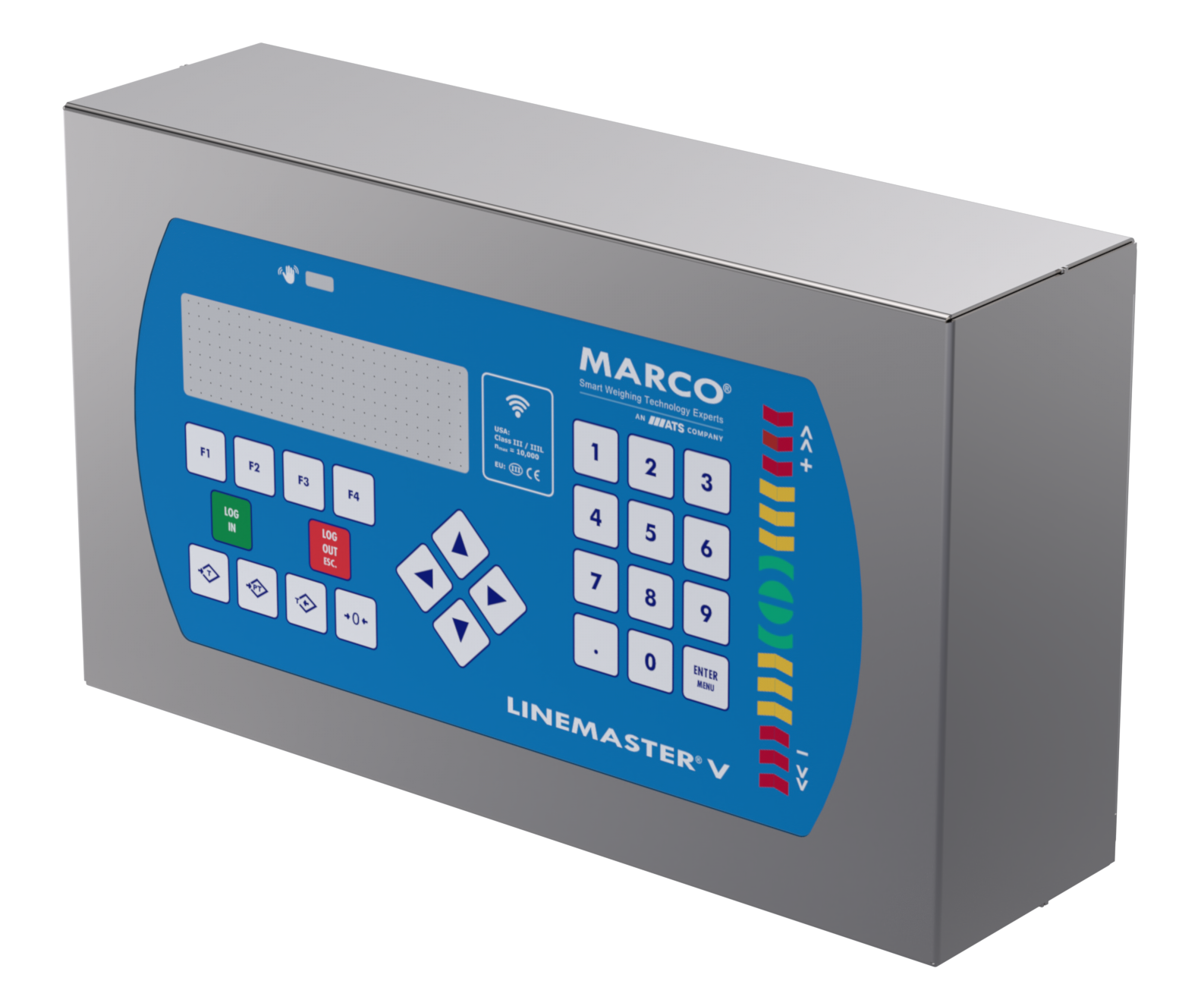 The LineMaster V indicator is designed for seamless integration with MARCO weighing workstations, connecting to an individual weighing platform within the MARCO Trac-IT Yield Control System.