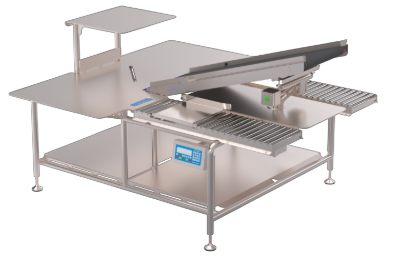 MARCO Twin Workstation with CheckMaster mounted indicator is purpose-built to streamline the rapid portioning of grapes and soft fruit. It features an integrated scale pan for precise weighing, dual waste chutes for separating different product grades, and dedicated tray holders for efficient handling.